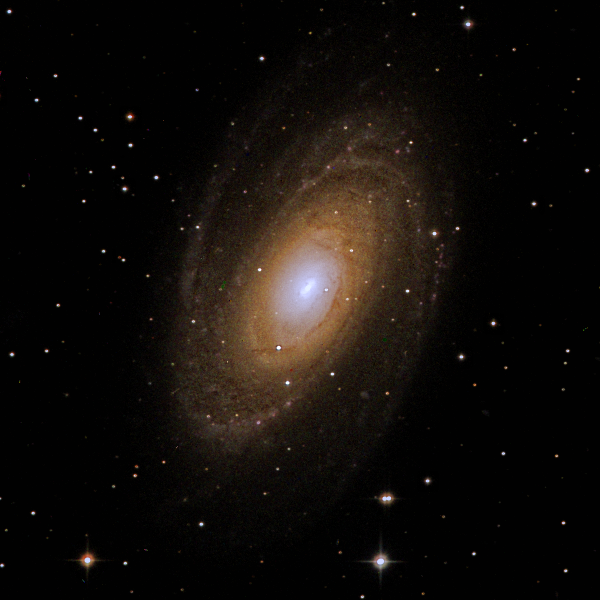 ![]() M81 (Bode's Galaxy) - 29Dec 2016 - Composite from 3x60"Lum + 1x60"Red + 1x60"Grn + 1x60"Blu A spiral galaxy about 12 million LY away in the constellation Ursa Major. Radius 45,000 LY, number of stars > 250 billion, AppMag 6.9, 27' x 14' Taken with Tenerife High Mag Telescope T1: 500mm (20") Dia x 3,500mm f/6.8 FOV: 37'x37' Camera: 3,056x3,056 px |